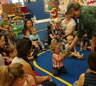 The basic Mother Goose on the Loose was designed for children birth to age 3 with their parents and caregivers to promote the development of the Whole Child, to enhance parent/child bonding and to provide a joyful early literacy environment that focuses on learning through play. It uses a variety of activities, such as rhymes, songs, puppets, a flannel board and felt pieces, books, and musical instruments to foster speech development, early language and math skills, motor coordination, imagination, exploration, self-confidence, and sensitivity to others.